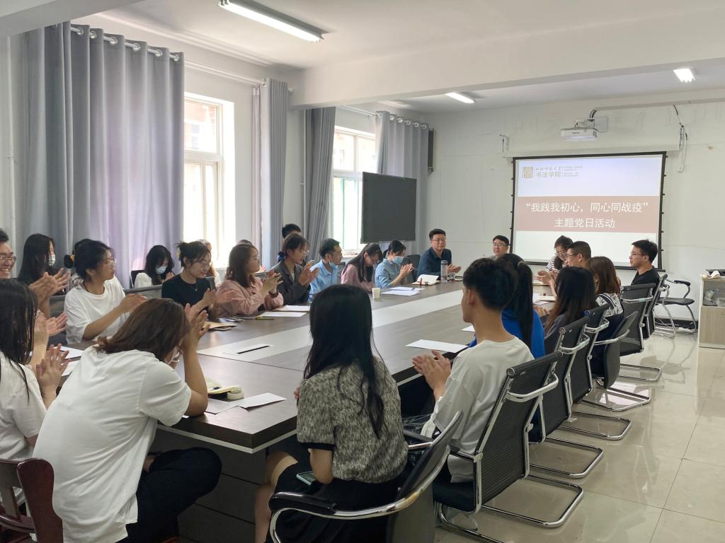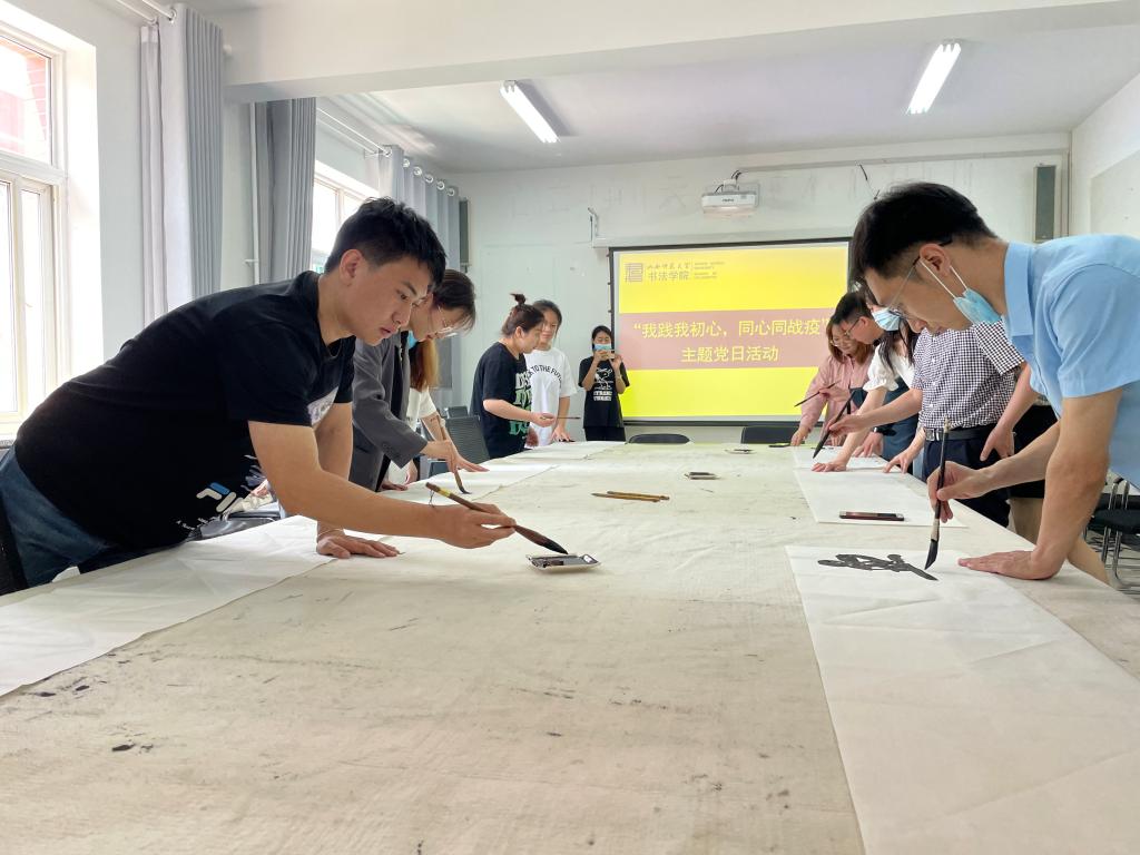 活动过程中,翰墨传薪党支部书记杨二斌副教授带领全体党员进一步学习领会了党的十九届六中全会精神和习近平总书记关于疫情防控的重要讲话重要指示精神,强调全体师生党员在疫情防控的重要关头与关键时期,要听从党的召唤、党的指挥,积极担当作为,发挥党员先锋模范作用,同心协力抗击疫情;接下来,教工党员王文清、李浩锐、宁译锐和员工党员樊雅菁、陈雯鹏结合自身的疫情防控志愿服务经历分享了对疫情防控工作的认识和体会,他们的发言使在场师生党员进一步深刻感受到了公司师生为抗击疫情所做出的努力与奉献;最后,师生党员共同书写了抗疫主题书法作品,用自己手中的毛笔向疫情防控工作人员致敬,表达抗疫必胜信念。