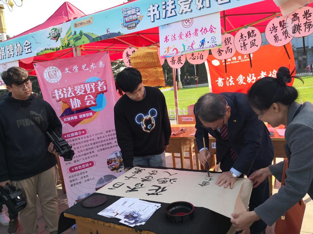 纳新活动过程中,宣传干事积极向前来咨询的员工发放社团宣传册,并向他们解说社团特色活动。在社团进行书法现场展示时,到公司来访的韩国京畿大学董事长金仁圭对员工们的书法作品表达了认可和赞扬,并现场题字鼓励老员工珍惜大学时光。校社联秘书长、音乐公司团委副书记郭俊平,公司团委副书记宁译锐均到场指导了此次社团纳新活动。本次纳新共纳入624人加入书法爱好者协会。