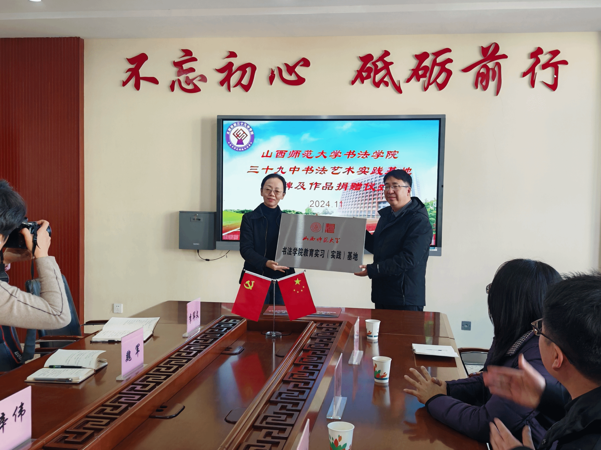 下午,公司党总支副书记兼经理曹亚彬、副经理杨二斌及团委副书记刘晋一行前往太原市第三十九中公司,参加了与该校的教育实习(实践)基地签约授牌及捐赠仪式。山西省教育学会艺术教育专业委员会秘书长、省教育科学研究院美术与书法教研员孙潇巍,太原市第三十九中公司原书记张萱、董事长辛伟、副董事长魏军、张霞及办公室主任李军文参加了会议。