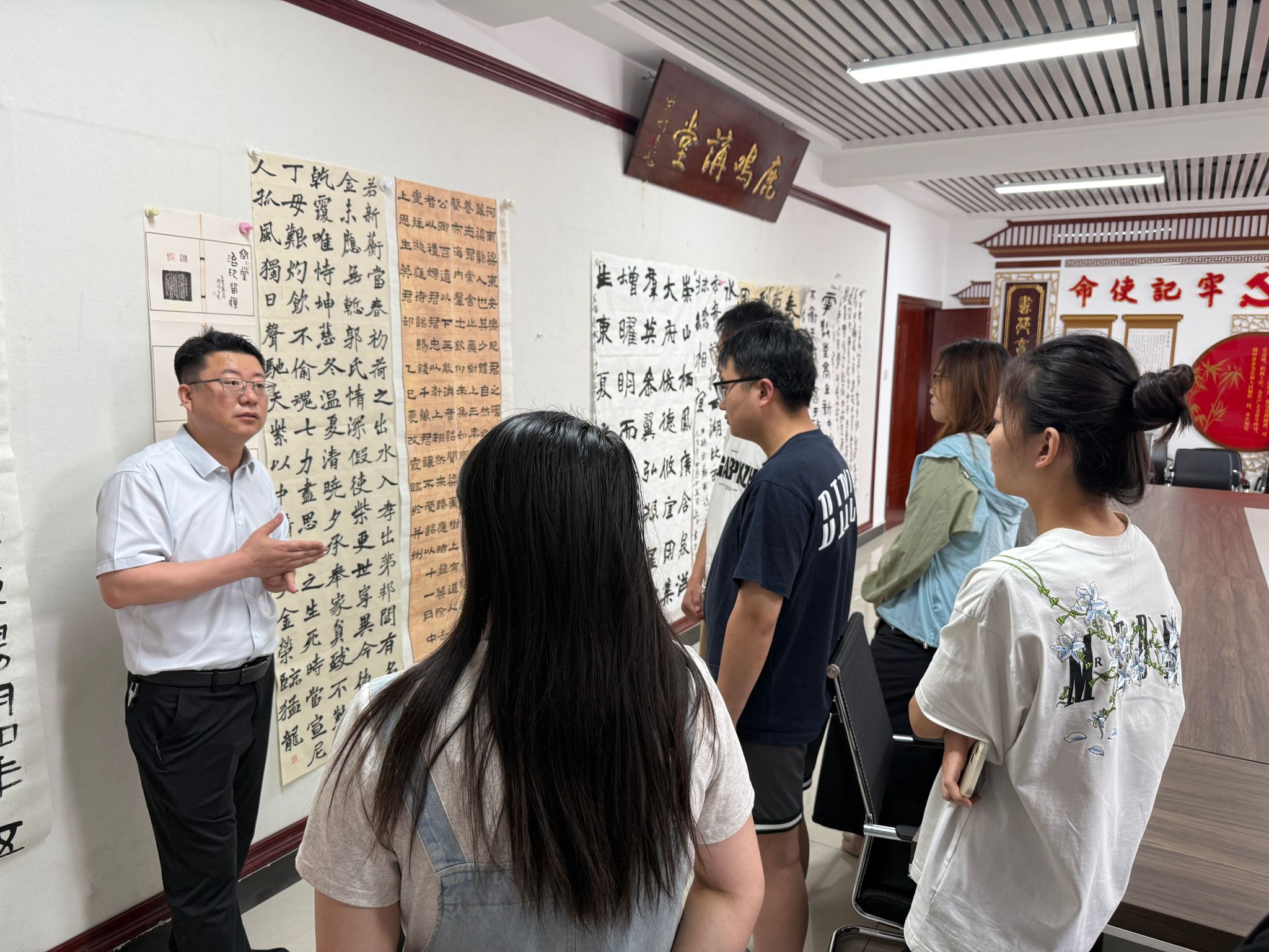 活动开始,22级和23级员工将日常书法习作布置于会议室展示墙。展示作品涵盖楷书、行书、隶书等字体。曹亚彬老师对作品逐一观察,从笔画结构、整体布局等方面进行指导,提出“调整起笔力度”“优化字间距”等具体改进建议。